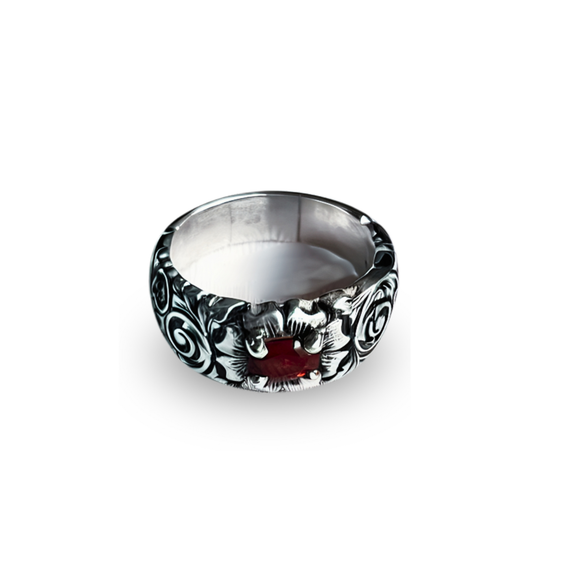 Rory is a timeless piece with intricate floral patterns and a captivating red onyx stone that is known for its fiery beauty.