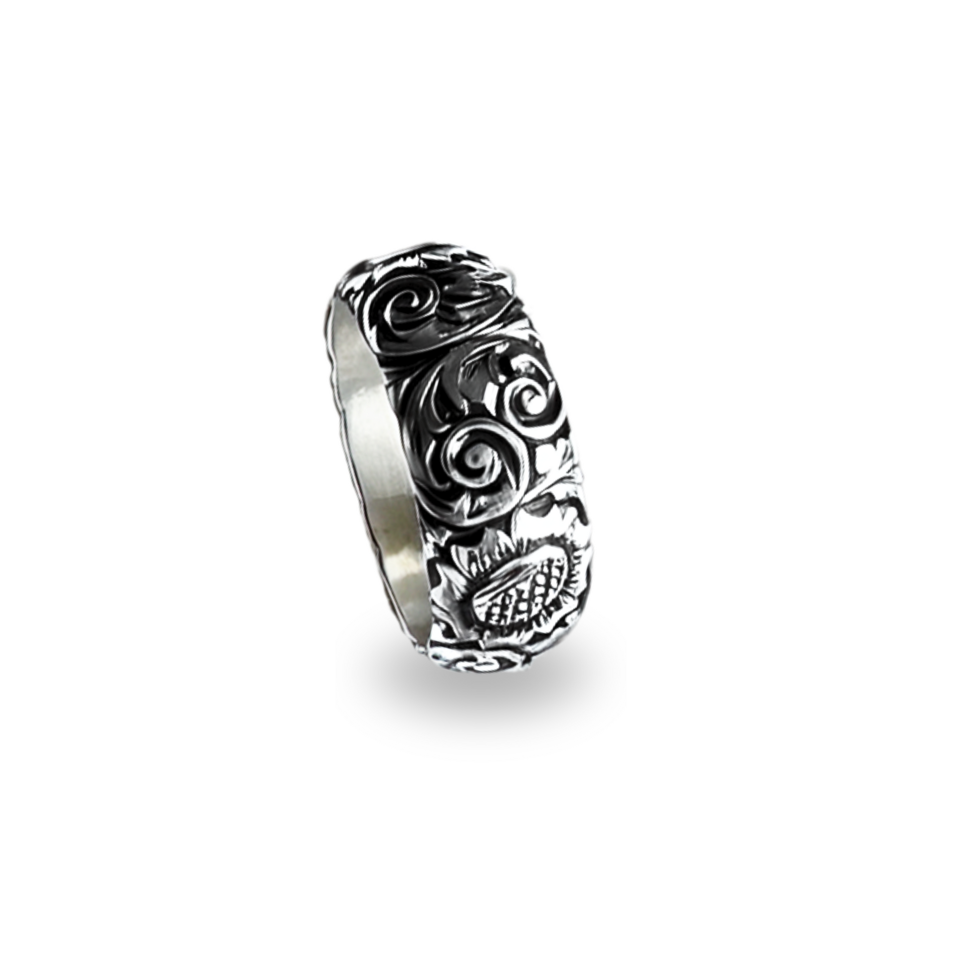 Caspian is a 925 sterling silver ring designed with intricate traditional push engraving technique. Its round shape offers a clean, classic look, while the detailed engraving adds texture and character. The ring’s subtle design makes it versatile for everyday wear, providing a refined touch to any outfit.